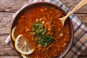 Harira is a traditional Moroccan soup. It is popular as a starter but is also eaten on its own as a light snack. There are many variations and it is mostly served during Ramadan, although it can be made throughout the year.