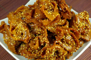 Chebakia is a pastry of Moroccan origin made of strips of dough rolled to resemble a rose, deep-fried until golden, then coated with a syrup made of honey and rosewater and sprinkled with sesame.