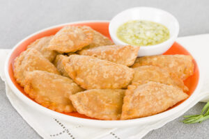 An empanada is a stuffed bread or pastry baked or fried in many countries in Latin America. The name comes from the Spanish verb empanar, meaning to wrap or coat in bread.